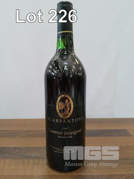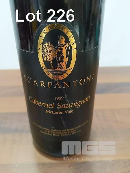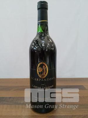 1989 SCARPANONI MCLAREN VALE CABERNET SAUVIGNON. SINGLE 750ML CLARET BOTTLE, UNDER CORK. FILL LEVEL "IN NECK". CAPSULE SOUND. BOTTLE & LABEL AVERAGE.