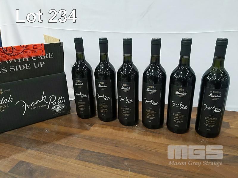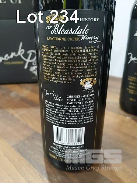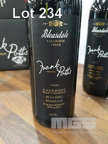 1996 BLEASDALE "FRANK POTS" LANGHORNE CREEK CABERNET SAUVIGNON, MALBEC, MERLOT, CABERNET FRANC. PACK OF 6 X 750ML BOTTLES, UNDER CORK. FILL LEVELS "TOP SHOULDER" TO "IN NECK". CAPSULES VERY GOOD (SEEPAGE ON ONE). BOX GOOD. BOTTLES AND LABELS VERY GOOD.