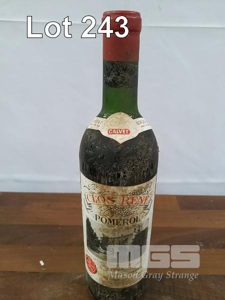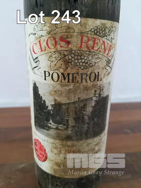 1966 CLOS RENE - POMEROL. SINGLE 75CL BOTTLE. * WINE FROM BORDEAUX, FRANCE * * APPELLATION POMEROL CONTROLEE * FILL LEVEL "VERY TOP SHOULDER". CAPSULE POOR (GRIMY & PERFORATED ON TOP). BOTTLE & LABEL POOR (GRIMY).