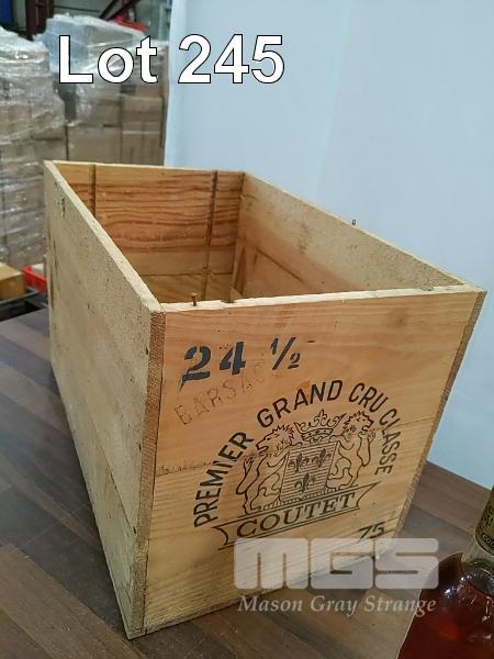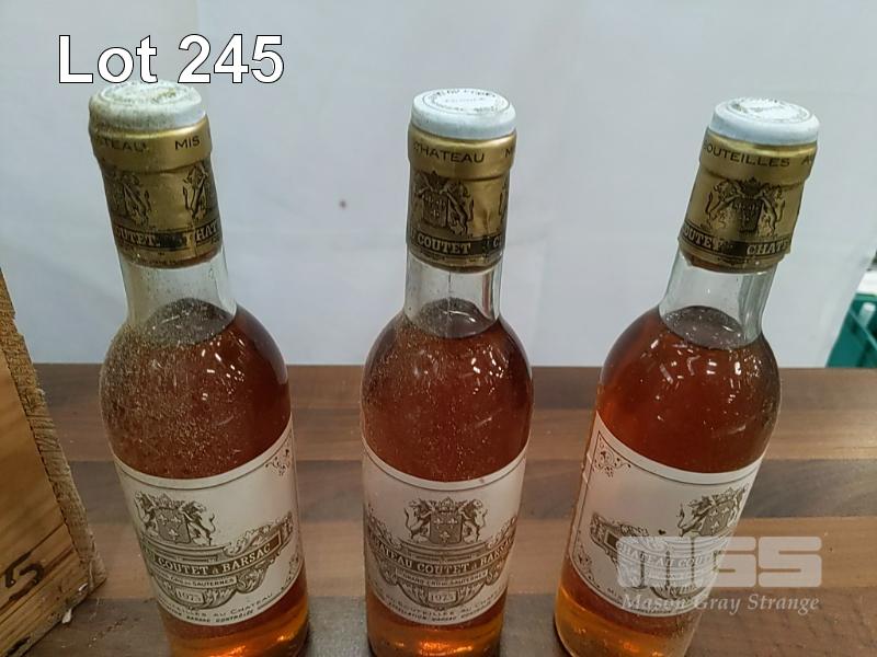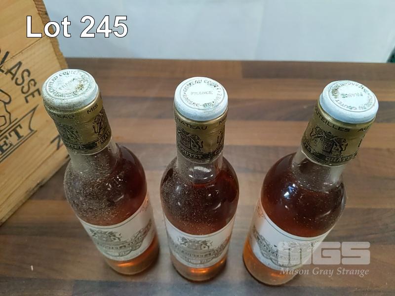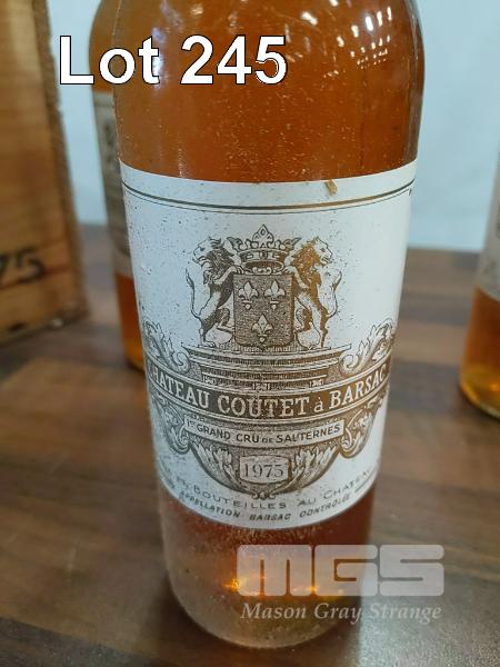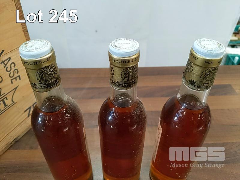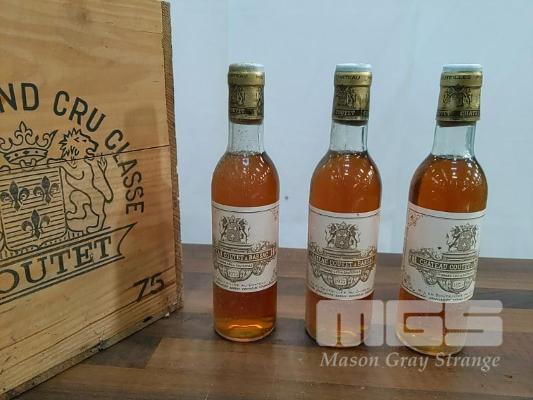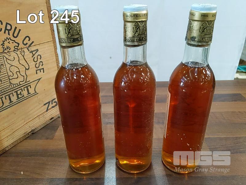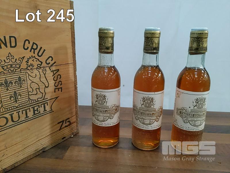 1975 CHATEAU COUTET A BARSAC - "PREMIER GRAND CRU DE SAUTERNS". 3 X 37.5cl HALF BOTTLES. INCLUDES ORIGINAL PACKING CRATE. * WINE FROM BARSAC COMMUNE, SAUTERNES, BORDEAUX FRANCE * ** CHATEAU COUTET ** ** PREMIER CRU ** * APPELLATION BARSAC CONTROLEE * FILL LEVELS "VERY TOP SHOULDER". CAPSULES AVERAGE TO FAIR. SOME MARKS AND OR CORROSION. BOTTLES FAIR (DUSTY). LABELS TWO FAIR TO GOOD.