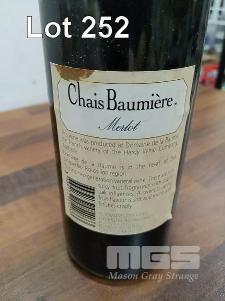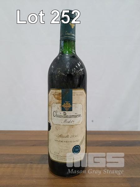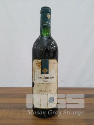 1990 CHAIS BAUMIERE MERLOT. SINGLE 75CL CLARET BOTTLE, UNDER CORK. ** WINE FROM THE LANGUEDOC REGION SOUTHERN FRANCE ** ** DOMAIN DE LA BAUME - FRENCH WINERY OPERATED BY THE HARDY WINE COMPANY ** FILL LEVEL "VERY TOP SHOULDER". CAPSULE SOUND. BOTTLE AND LABELS AVERAGE.