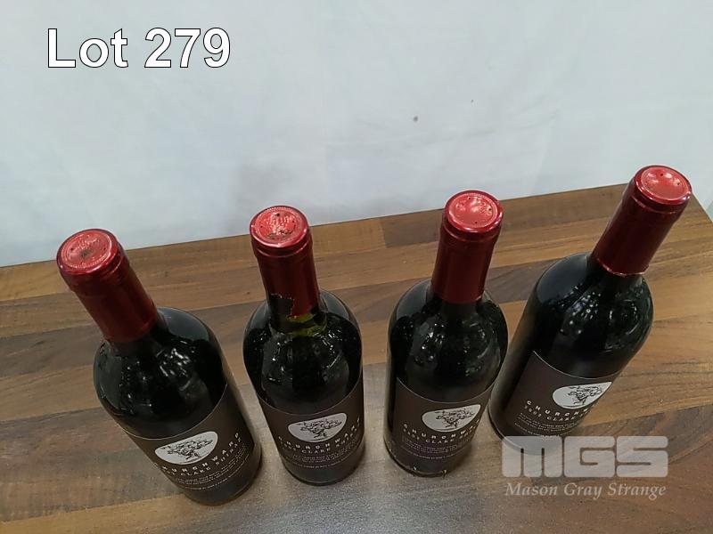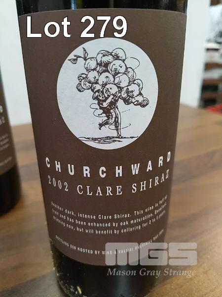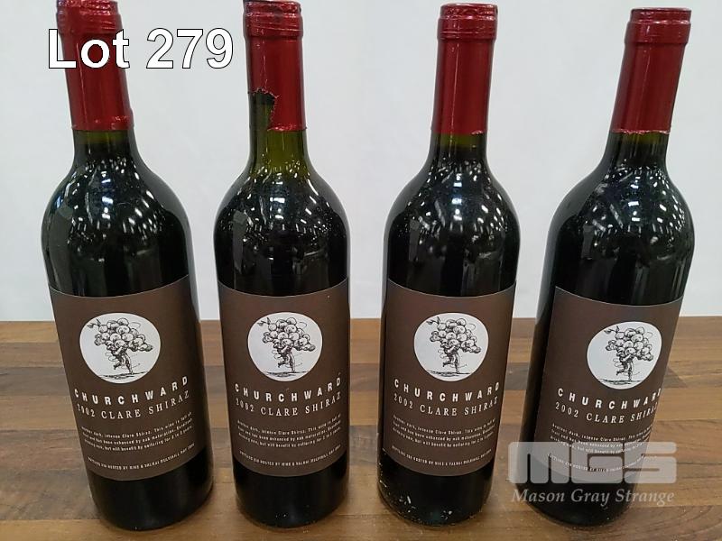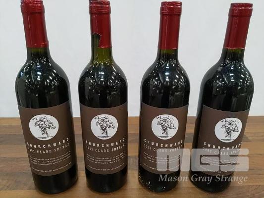 2002 "CHURCHWARD" CLARE SHIRAZ. 4 X 750ML CLARET BOTTLES, UNDER CORK. ** BOTTLED BY THE CHURCHWARD BOTTLING CLUB ** ** CHURCHWARD BOTTLING No. 258 ** ** BOTTLED MAY, 2004 ** FILL LEVELS THREE "IN NECK". ONE "TOP SHOULDER". CAPSULES SOUND, ONE TORN AT BASE. BOTTLES & LABELS FAIR TO GOOD.
