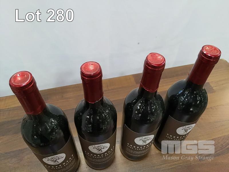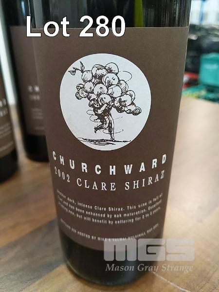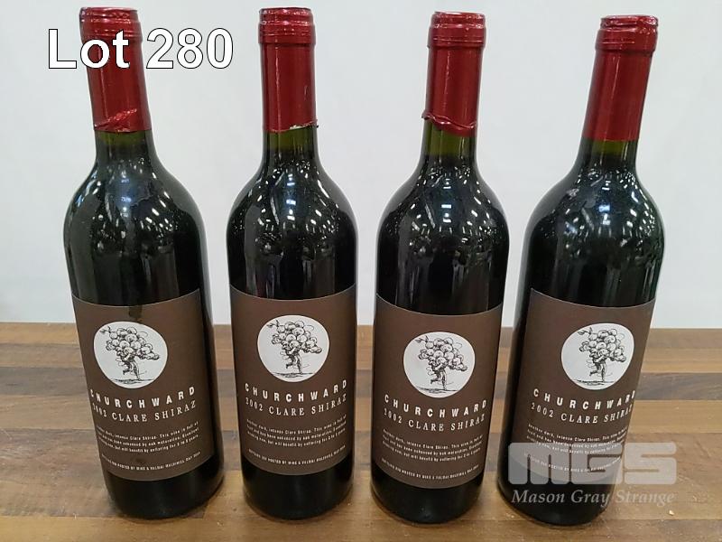2002 "CHURCHWARD" CLARE SHIRAZ. 4 X 750ML CLARET BOTTLES, UNDER CORK. ** BOTTLED BY THE CHURCHWARD BOTTLING CLUB ** ** CHURCHWARD BOTTLING No. 258 ** ** BOTTLED MAY, 2004 ** FILL LEVELS "ALL IN NECK". CAPSULES SOUND, THREE GATHERED AT BASE. BOTTLES & LABELS FAIR TO GOOD. DRIP STAIN ON ONE.