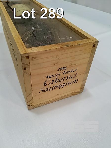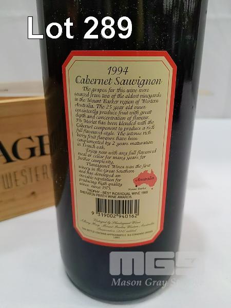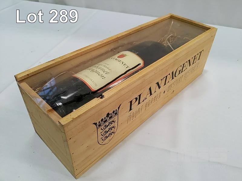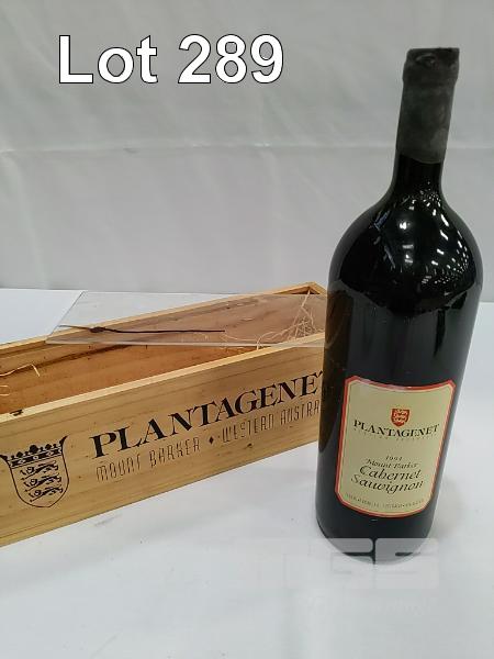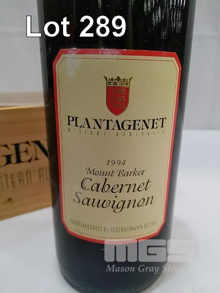 1994 PLANTAGENET MOUNT BARKER CABERNET SAUVIGNON. SINGLE 1.5L MAGNUM, UNDER CORK IN SLIDING LID WOODEN PRESENTATION BOX. FILL LEVEL "TOP SHOULDER". CAPSULE POOR, LEAKAGE EVIDENT. BOX EXTERIOR FAIR BUT HAS INTERNAL STAINS. BOTTLE AND LABELS FAIR TO GOOD.