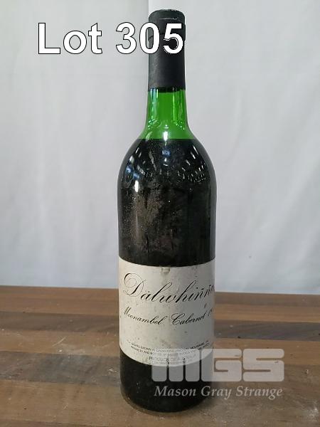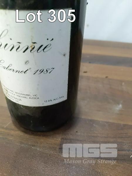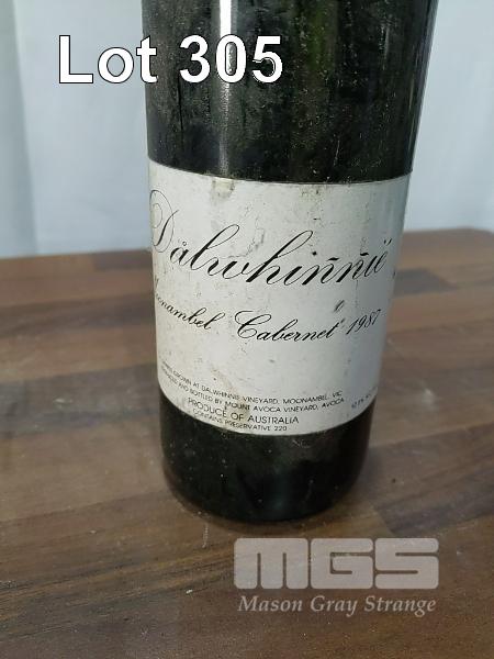 1987 DALWHINNIE MOONAMBEL CABERNET SAUVIGNON. SINGLE 750ML CLARET BOTTLE, UNDER CORK. FILL LEVEL TOP SHOULDER. CAPSULE FAIR, SCUFFS ON TOP. BOTTLE & LABEL FAIR.