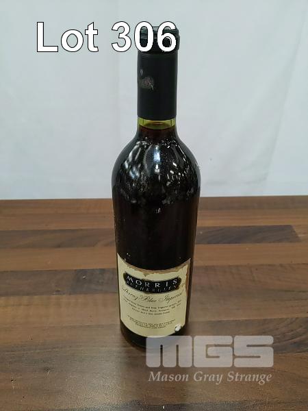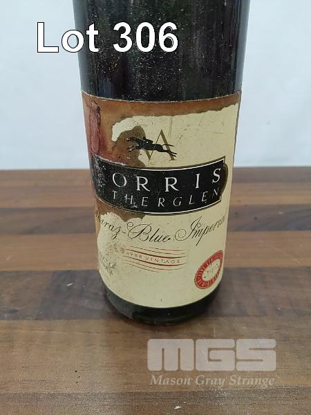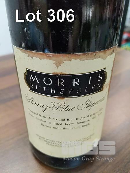 1988 MORRIS OF RUTHERGLEN SHIRAZ-BLUE IMPERIAL. SINGLE 750ML CLARET BOTTLE, UNDER CORK. FILL LEVEL "IN NECK". CAPSULE GOOD. BOTTLE FAIR. LABELS POOR, STAINED.