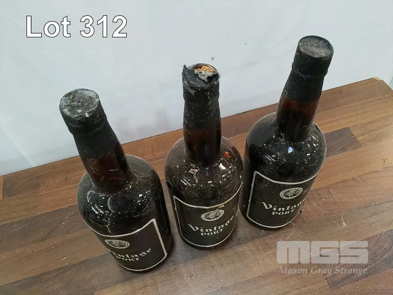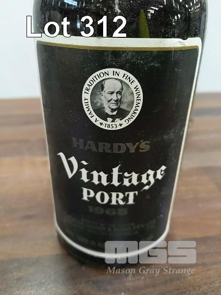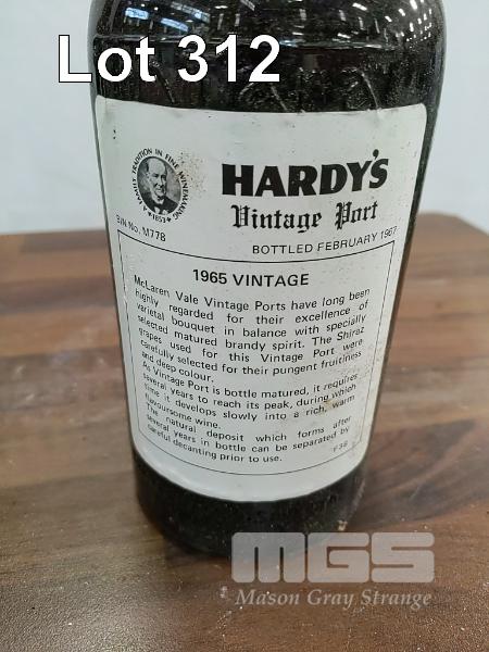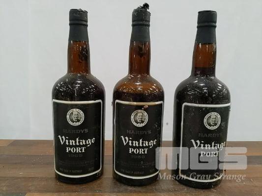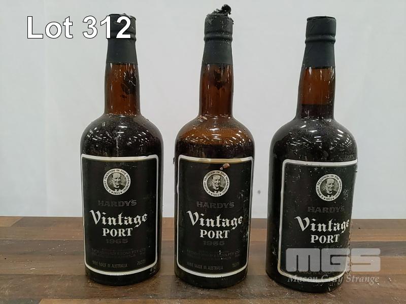 1965 HARDY'S VINTAGE PORT - BIN No. M778. 3 X 750ML PORT BOTTLE, UNDER CORK. CASULES AVERAGE, ONE WITH TORN TOP. BOTTLES & LABELS FAIR TO AVERAGE.