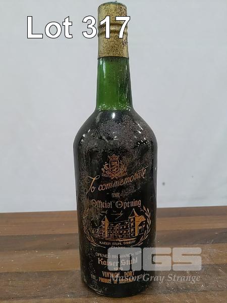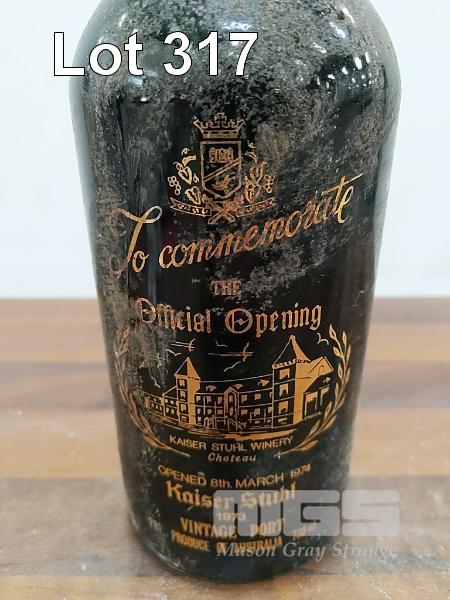1973 KAISER STUHL VINTAGE PORT. "TO COMMEMORATE THE OFFICIAL OPENING KAISER STUHL WINERY" SINGLE 738ML PORT BOTTLE, UNDER CORK. ** OPENED 8TH MARCH 1974 BY PRIME MINISTER GOUGH WHITLAM ** CAPSULE HAS SOME CORROSION. BOTTLE GRUBBY. ETCHED LABEL IS SOUND.