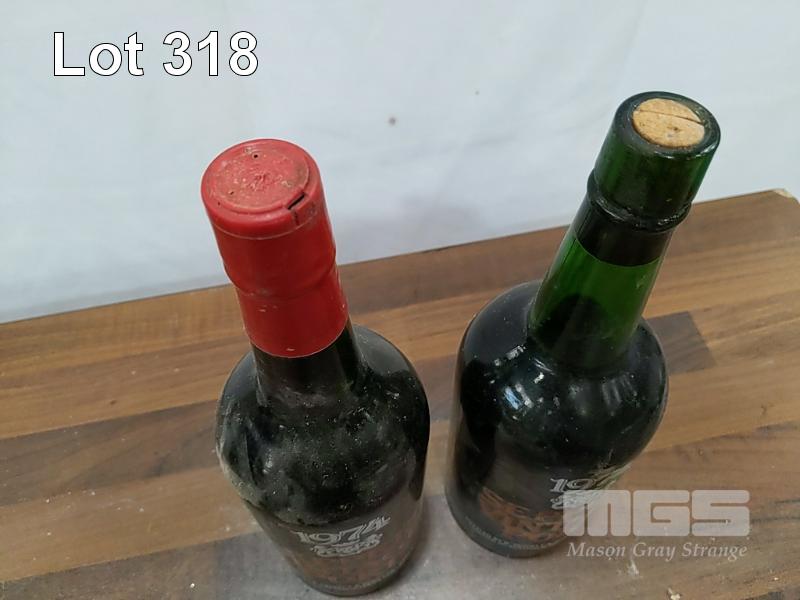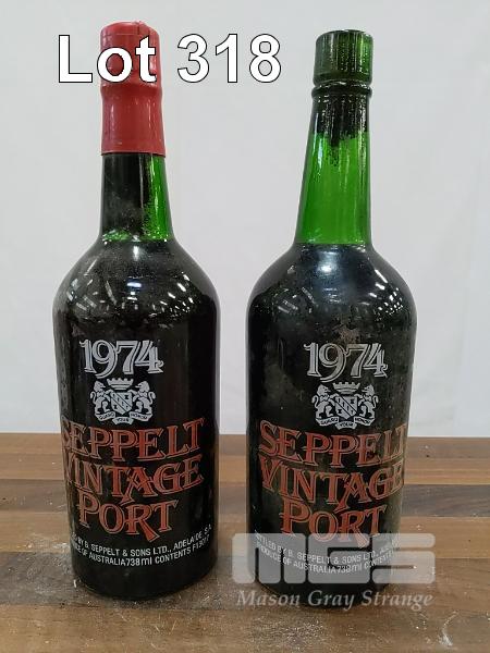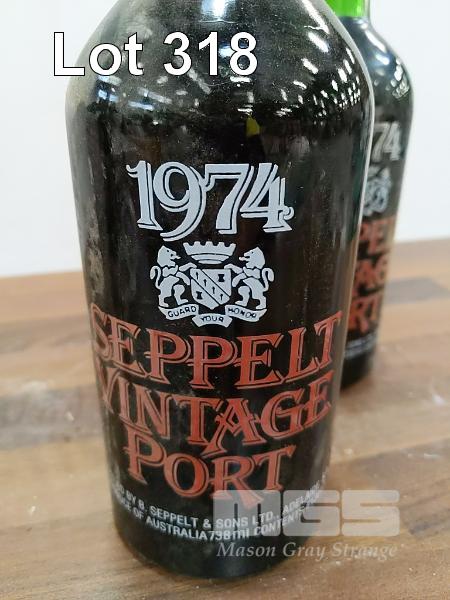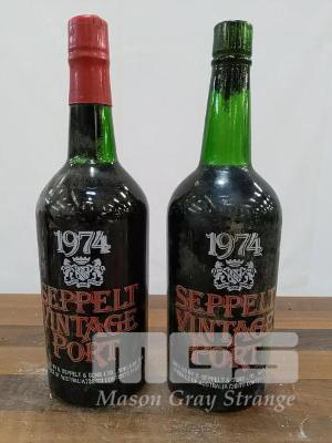 1974 SEPPELT VINTAGE PORT. 2 X 738ML PORT BOTTLES, UNDER CORK. PLASTIC CAPSULE OFF ONE. ONE GOOD. BOTTLES GRUBBY. ETCHED LABELS SOUND.