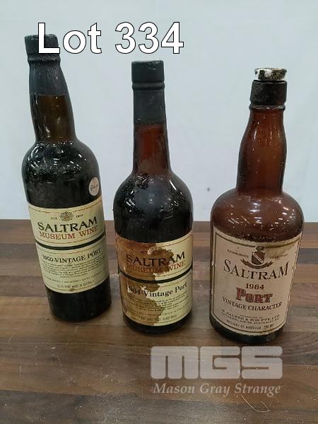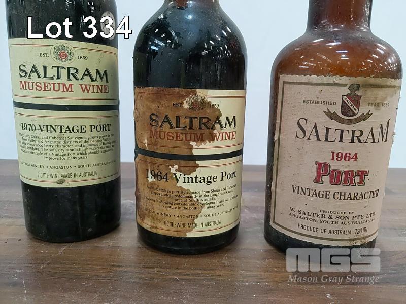 THREE BOTTLES OF AGED SALTRAM VINTAGE PORTS COMPRISING 1 X 1964 SALTRAM "VINTAGE CHARACTER" PORT. 738ML. ** OPENED ** - FILL LEVEL WELL BELOW SHOULDER. 1 X 1964 SALTRAM VINTAGE PORT. 710ML PORT BOTTLE. 1 X 1970 SALTRAM "MUSEUM WINE" VINTAGE PORT. 710ML HIGH SHOULDER PORT BOTTLE. BOTTLES & LABELS AVERAGE TO FAIR.