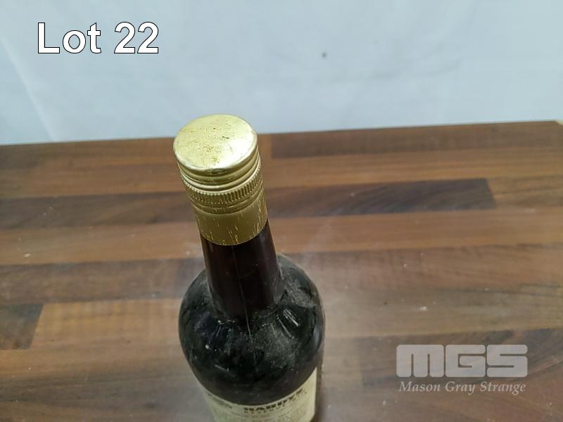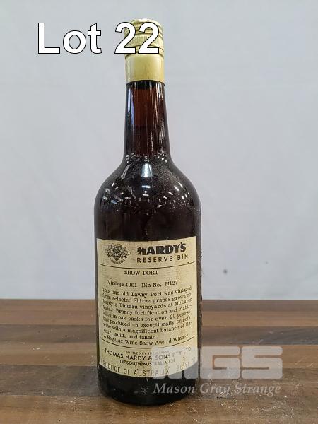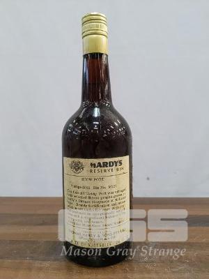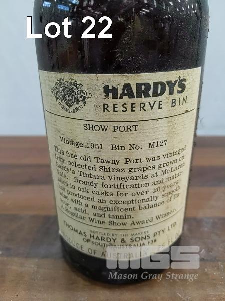 1951 HARDY'S RESERVE BIN "SHOW PORT" TAWNY PORT - BIN No. M127. SINGLE "26 FL OZ" PORT BOTTLE, UNDER SCREW CAP. FILL LEVEL EXCELLENT. SCREW CAP SOUND, SMALL INDENT ON RIM. BOTTLE HAS SOME CAKED DIRT. LABEL FAIR TO GOOD.
