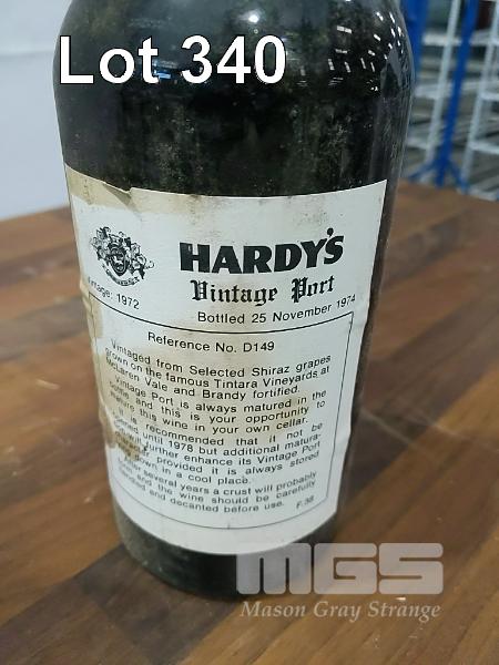 1972 HARDY'S VINTAGE PORT. SINGLE 750ML PORT BOTTLE, UNDER CORK. * REFERENCE No. D149. BOTTLED NOVEMBER 1974 * CAPSULE AVERAGE. BOTTLE & LABEL AVERAGE.