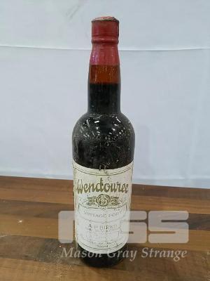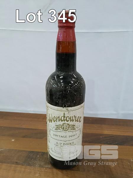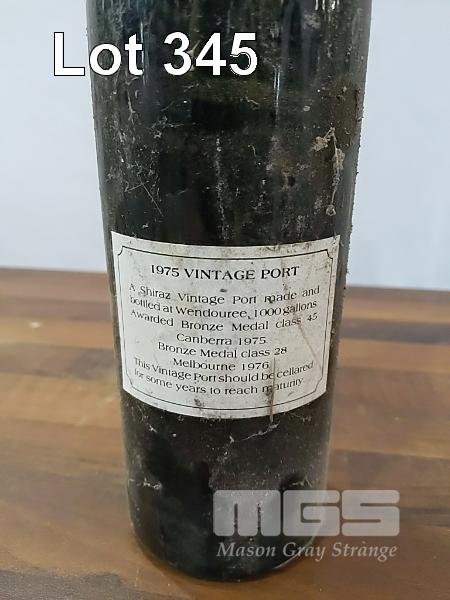 1975 WENDOUREE VINTAGE PORT. SINGLE 750ML PORT BOTTLE, UNDER CORK. CAPSULE AVERAGE, CORK SLIGHTLY PUSHED. BOTTLE HAS CELLAR DUST. LABELS AVERAGE TO GOOD.