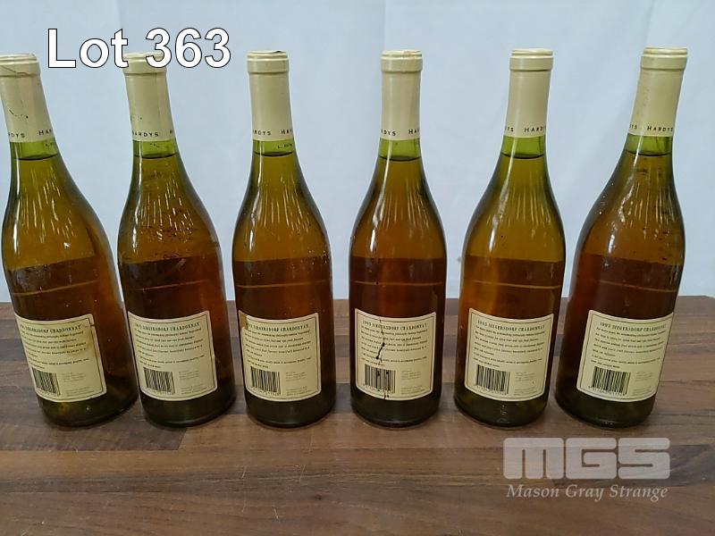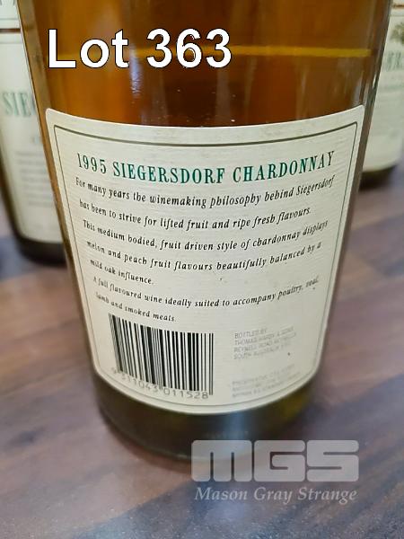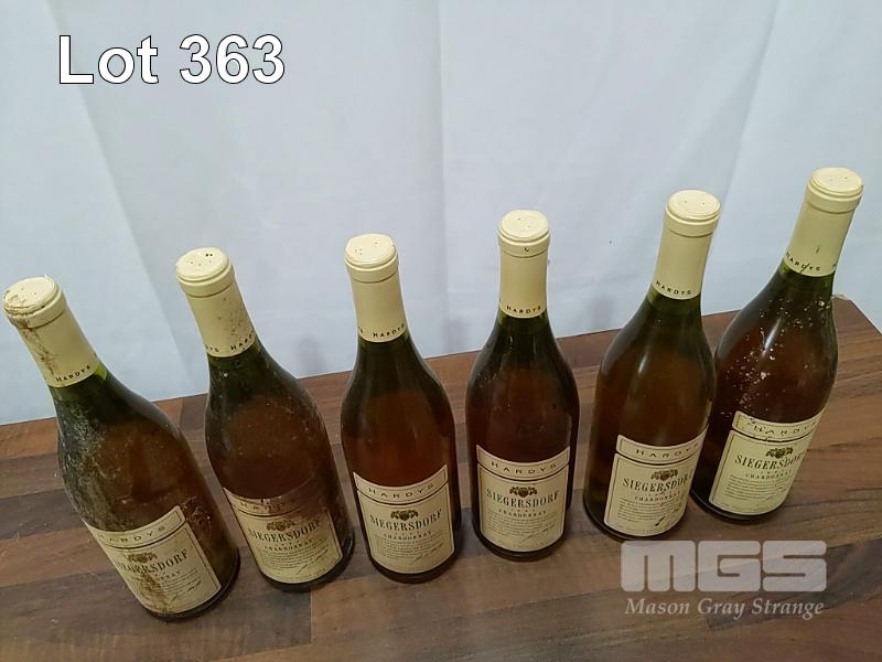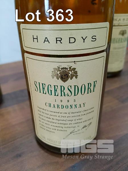 1995 HARDYS SIEGERSDORF CHARDONNAY. 6 X 750ML BURGUNDY BOTTLES, UNDER CORK. FILL LEVELS ALL "1 CM". CAPSULES FAIR BOTTLES & LABELS FAIR TO POOR.