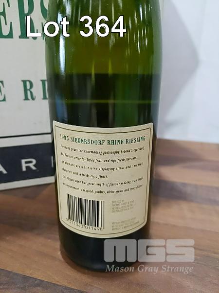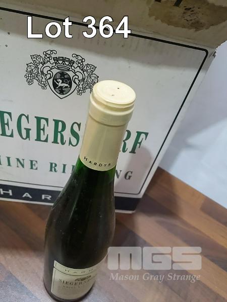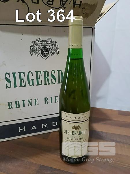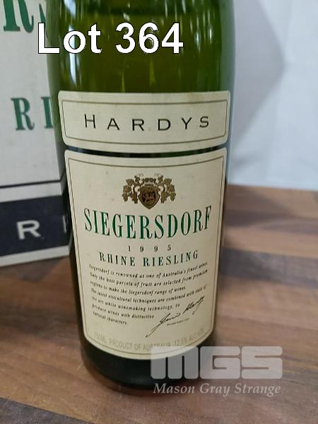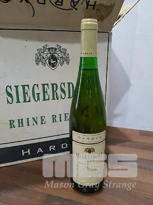 1995 HARDYS "SEIGESDORF" RHINE RIESLING. CASE OF 10 X 750ML RIESLING BOTTLES, UNDER CORK. FILL LEVELS "LESS THAN 3CM". CASE, CAPS, BOTTLE & LABELS FAIR TO GOOD.