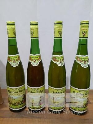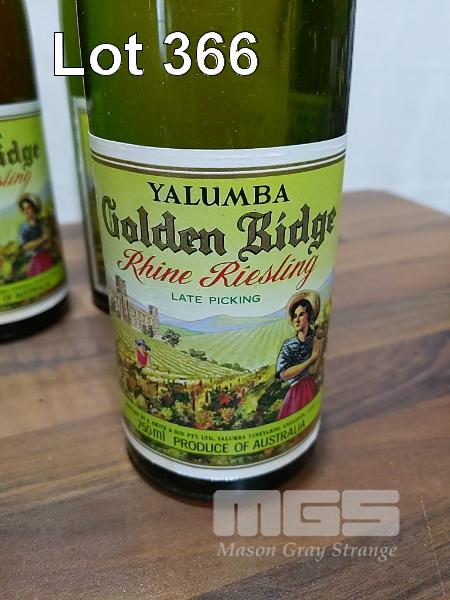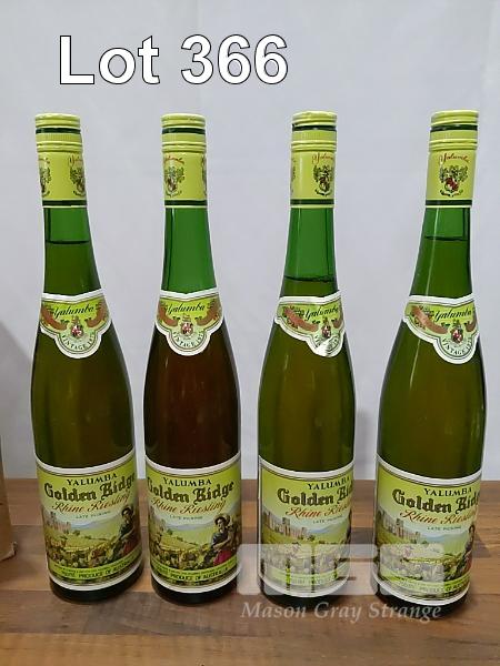 1973 YALUMBA "GOLDEN RIDGE" RHINE RIESLING - LATE PICKING. 4 X 750ML RIESLING BOTTLES, UNDER SCREW CAP. ** BOTTLED UNDER SCREW CAP ** FILL LEVELS VARY "ABOUT 40MM". CASE, CAPS, BOTTLE & LABELS FAIR TO GOOD. SOME KNOCKS & SCUFFS.