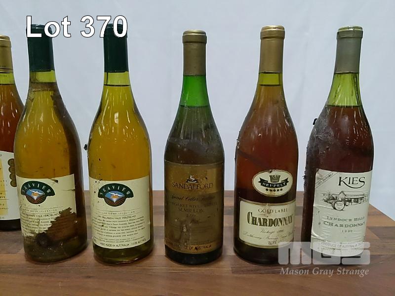 COLLECTION OF AGED WHITE WINES COMPRISING: 1 X 1969 GLENLOTH WHITE BURGUNDY, 750ML BURGUNDY BOTTLE, UNDER CORK. 6 X 1972 SALTRAM WHITE BURGUNDY BIN 72/45, 750ML BURGUNDY BOTTLES, UNDER CORK. 1 X 1980 SANDALFORD " SPECIAL CELLAR RELEASE" MARGARET RIVER ESTATE SEMILLON, 750ML BURGUNDY BOTTLE, UNDER CORK. 1 X 1990 KIES "LYNDOCH HILLS" CHARDONNAY, 750ML PUNTED BURGUNDY BOTTLE, UNDER CORK. 1 X 1992 SEPPELT "GOLD LABEL" CHARDONNAY, 750ML PUNTED BURGUNDY BOTTLE, UNDER CORK. 2 X SEAVIEW "CELLAR DOOR SELECTION" MCLAREN VALE VERDELHO, 750ML PUNTED BURGUNDY BOTTLES, UNDER CORK. 6 X 1996 RENMANO " CHAIRMANS SELECTION SHOW RESERVE" CHARDONNAY, 750ML PUNTED BURGUNDY BOTTLES, UNDER CORK. 3 X 1996 PETER LEHMANN "THE BAROSSA" EDEN VALLEY RIESLING, 750ML RIESLING BOTTLES, UNDER CORK. 1 X 1996 PEWSEY VALE "INDIVIDUAL VINEYARD SELECTION" RIESLING, 750ML RIESLING BOTTLE, UNDER CORK. 1 X 2011 DYED IN THE WOOL SAUVIGNON BLANC SEMILLON. " A MARGARET RIVER DROP, 750ML CLARET BOTTLE, UNDER SCREW CAP. ** WINES IN VARIOUS STATES & PRESENTATION **