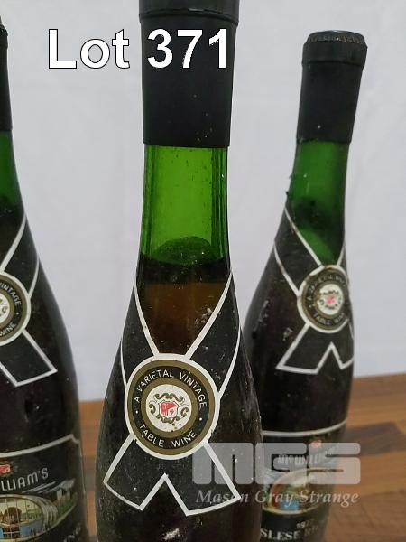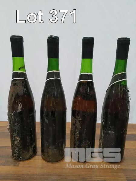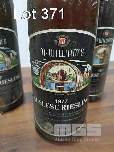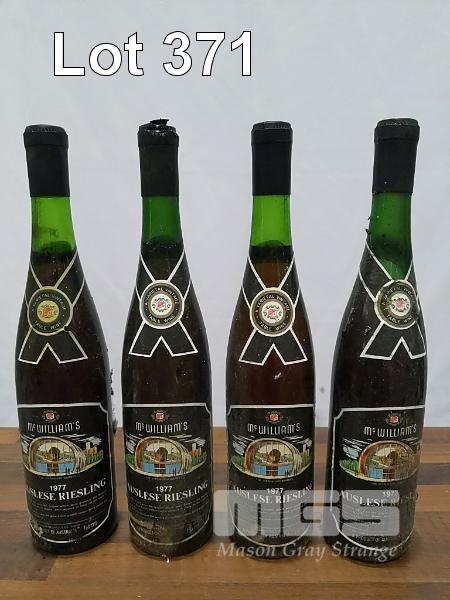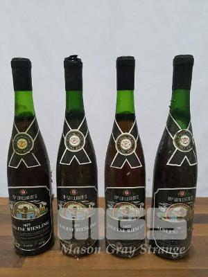 1977 MCWILLIAMS AUSLESE RIESLING IV56. 4 X 750ML RIESLING BOTTLES, UNDER CORK. FILL LEVELS THREE AT "4CM", ONE AT "8CM". PLASTIC CAPS AVERAGE TO POOR. BOTTLES & LABELS FAIR TO POOR.