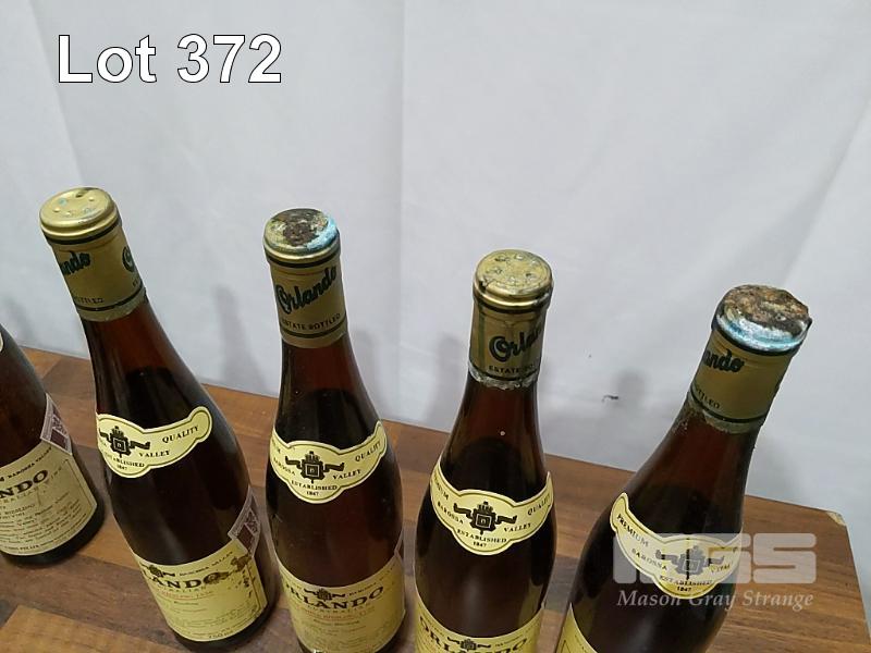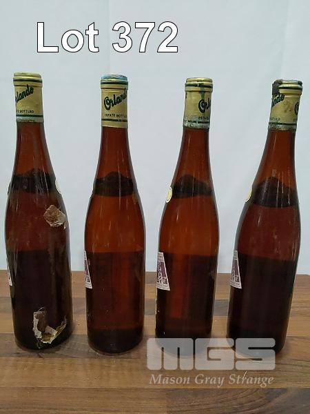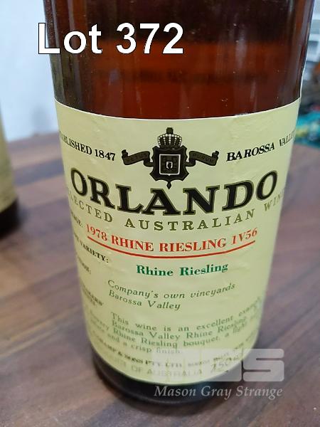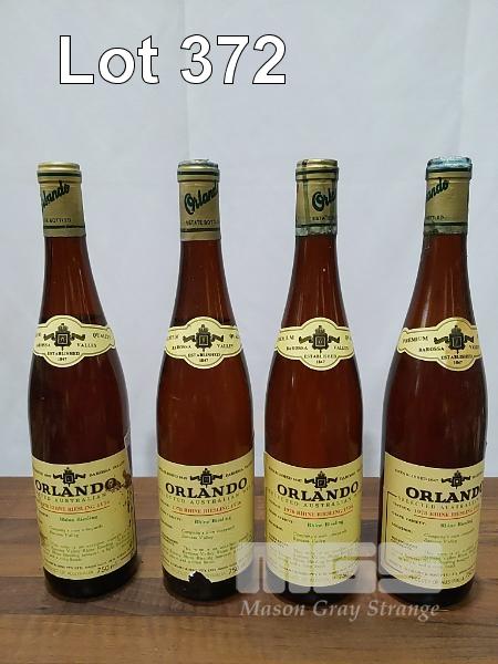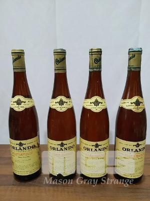 1978 ORLANDO RHINE RIESLING. 4 X 750ML RIESLING BOTTLES, UNDER CORK. FILL LEVELS AT "7 TO 8CM". CAPSULES FAIR TO POOR. THREE WITH CORROSION. BOTTLES & LABELS GOOD TO FAIR. ONE LABEL TORN.