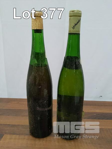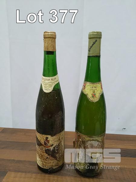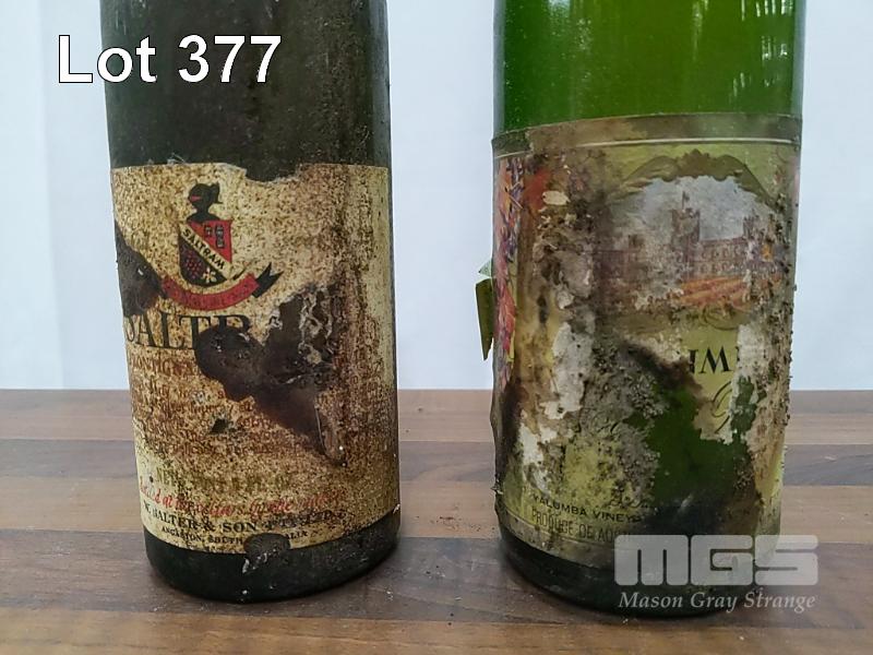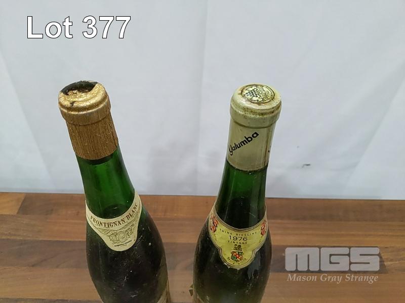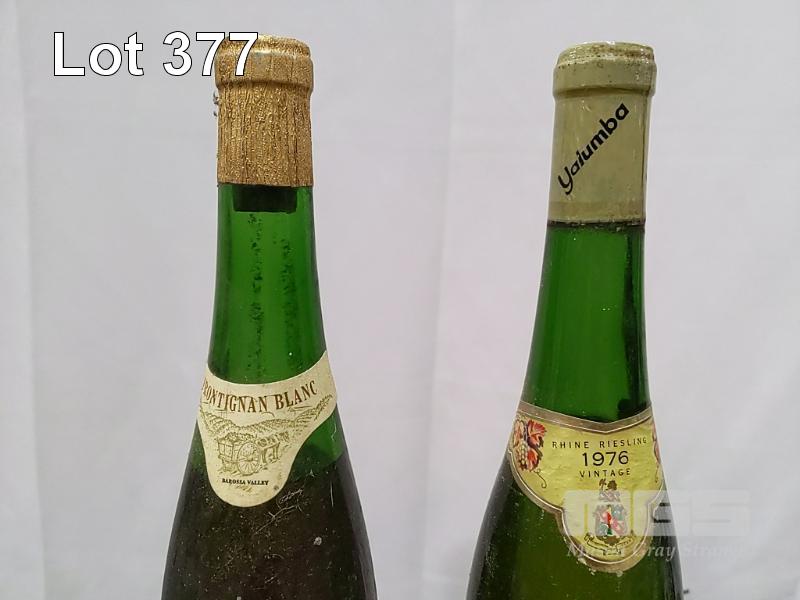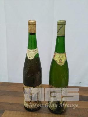 TWO AGED RIESLINGS, DAMAGED LABELS 1 X 1976 YALUMBA RHINE RIESLING, 750ML RIESLING BOTTLE, UNDER CORK. 1 X 1969 SALTRAM BAROSSA VALLEY FRONTIGNAN BLANC, 750ML RIESLING BOTTLE, UNDER CORK. ** NO OTHER DETAILS LEGIBLE ** FILL LEVELS "7 TO 8CM". CAPSULES FAIR. BOTTLES FAIR. LABELS DAMAGED, ILLEGIBLE.