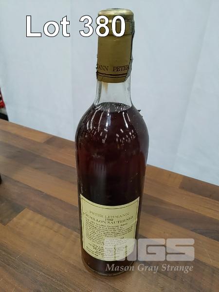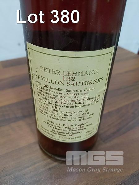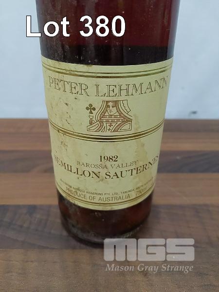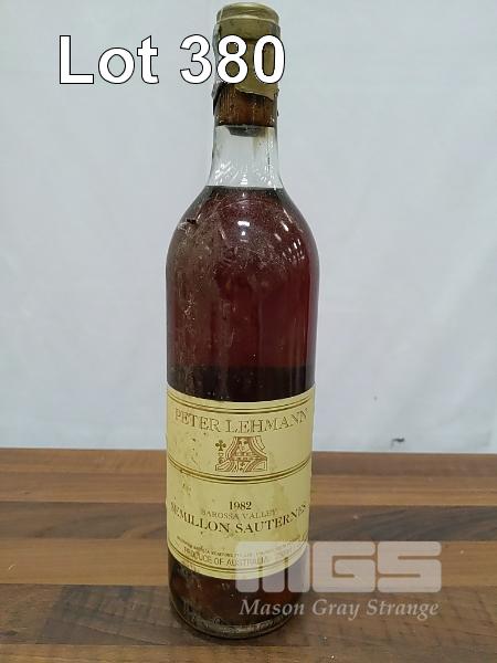 1982 PETER LEHMAN BAROSSA VALLEY SEMILLON SAUTERNS. SINGLE 750ML CLARET BOTTLE, UNDER CORK. ** AUSTRALIAN SAUTERN STYLE "STICKY" WHITE WINE ** FILL LEVEL "VERY TOP SHOULDER". CAPSULE POOR, TORN. BOTTLE & LABEL FAIR.