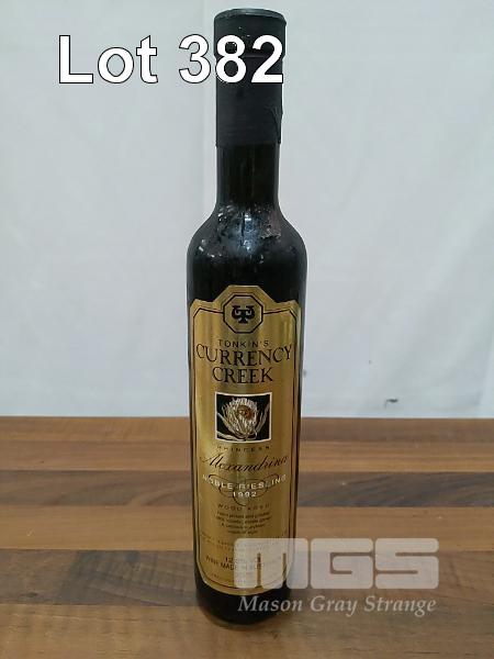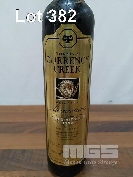 1992 TONKINS CURRENCY CREEK "PRINCESS" ALEXANDRINA NOBLE RIESLING SINGLE 375ML HALF BOTTLE, UNDER CORK. ** AUSTRALIAN "STICKY" SWEET WHITE WINE ** FILL LEVEL "BASE OF NECK". CAPSULE GOOD. BOTTLE & LABEL FAIR.