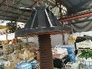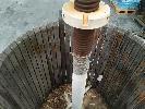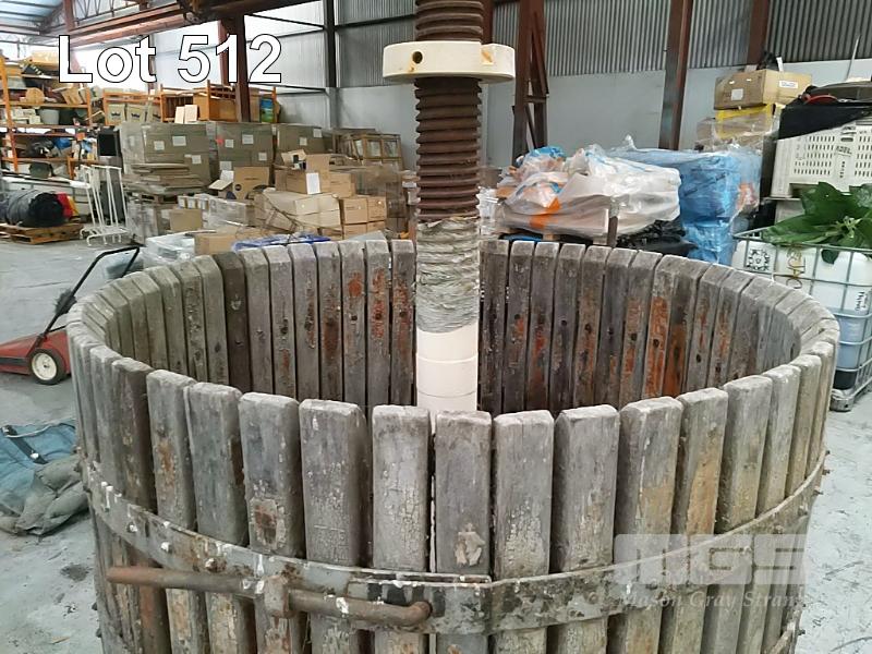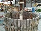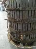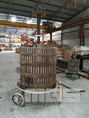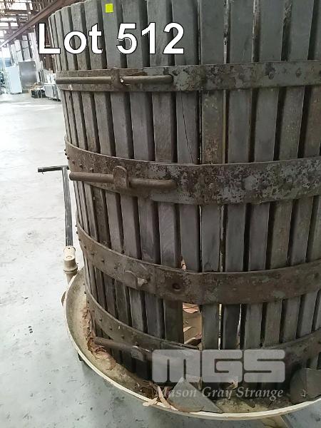 LARGE WINE GRAPE BASKET PRESS CAGE. CAGE DIAMETER 108CM. HEIGHT 115CM 2 X CAGE SECTIONS WITH 7 X LOCKING PINS. MOBILE DRAINING BASE WITH HANDLE. INTRINSIC THREADED SHAFT. ** REST OF PRESS NOT PRESENT **