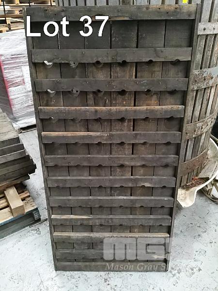 ANTIQUE TRADITIONAL METHODE CHAMPENOISE RIDDLING RACK. 60 BOTTLE PLACES, 730 X 1500 MM (W X H). DARK STAINED TIMBER. * PHOTOGRAPH INDICATIVE *