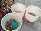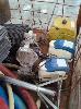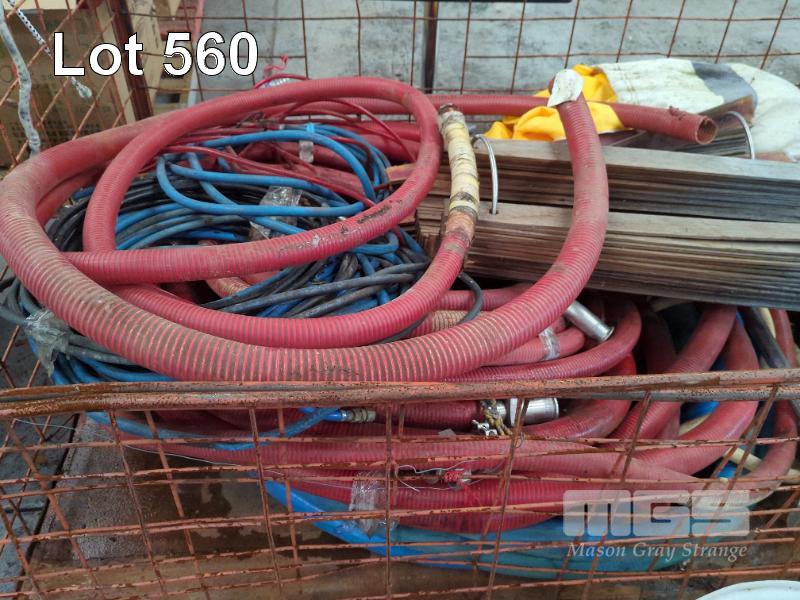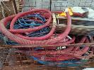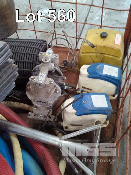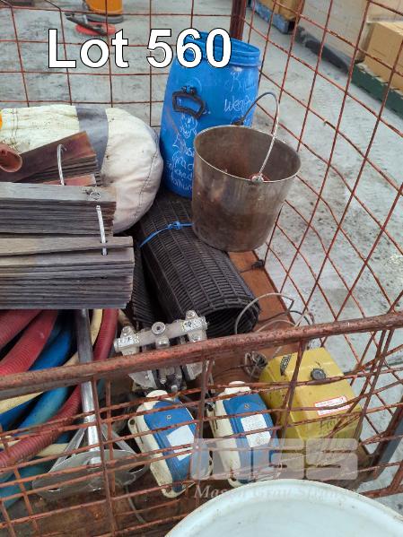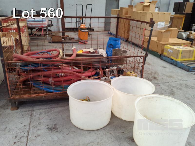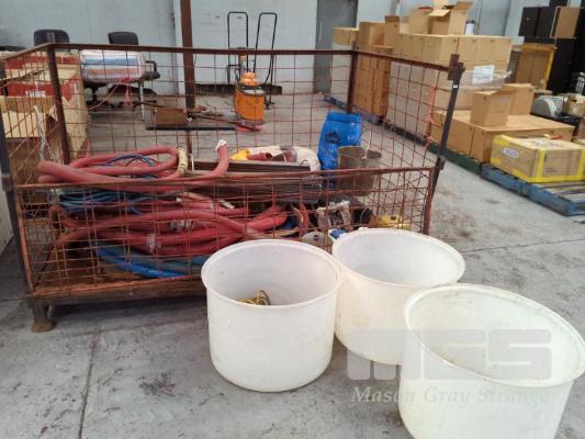 ASSORTED USED WINERY EQUIPMENT INCLUDING WINE HOSE & STAINLESS STEEL FITTINGS, STAINLESS STEEL HAND MIXER/PLUNGER, BUCKET, FOOD GRADE TUBS, TANK STAVE RINGS, RUBBER FLOOR MATTING, ARO AIR PUMP, AERATOR PUMPS AND MORE. CONTENTS OF CAGE (CAGE NOT INCLUDED). ** CONDITION OF PUMPS UNKNOWN **