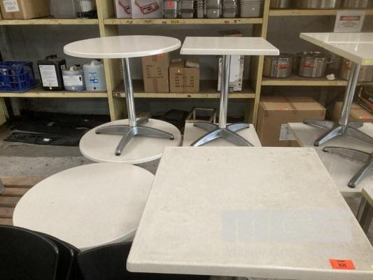 6 x CAFE TABLES, 3 @ 80cm DIAM & 3 @ 60 x 60cm & DRY BAR