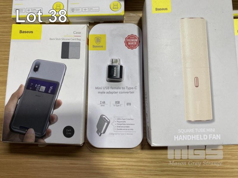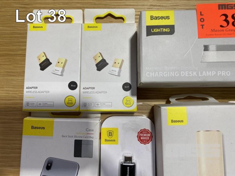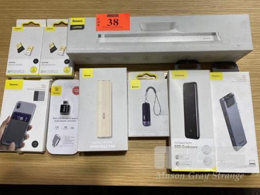 BASEUS CHARGING DESK LAMP PRO, WIRELESS ADAPTERS, BACK STICK SILICONE BARD BAG, USB TO TYPE-C ADAPTER, HANDHELD FAN, ANTI-LOST TRACKER, SSD ENCLOSURE & THUNDERBOLT C PRO HUB