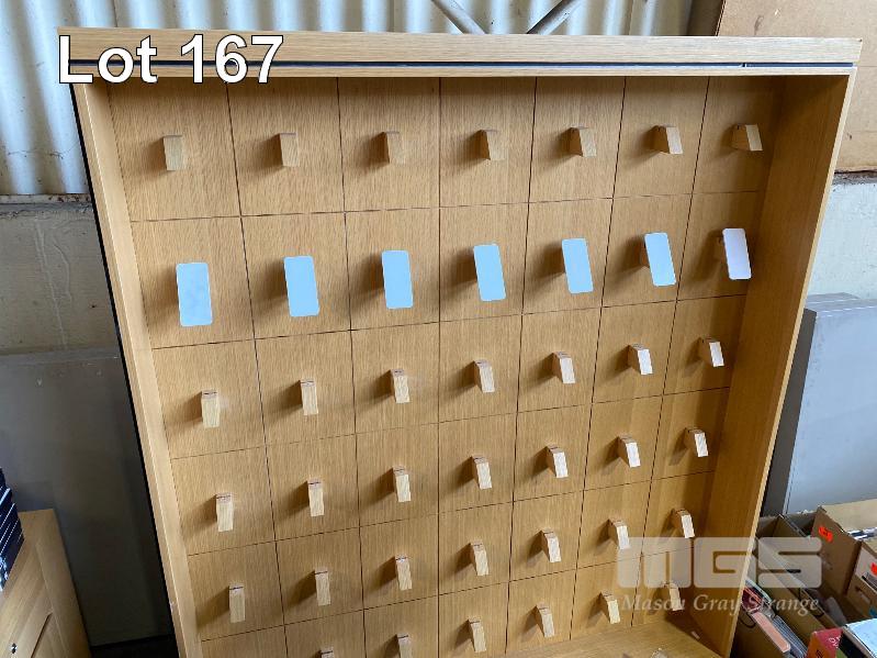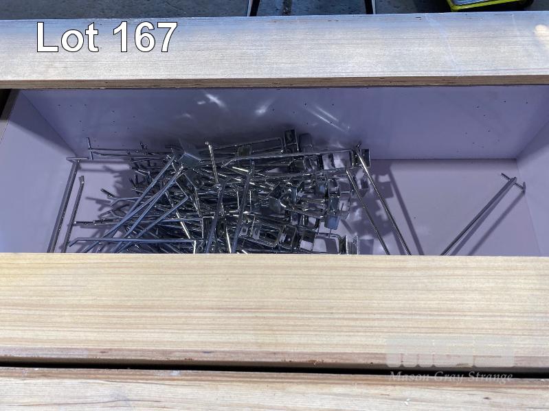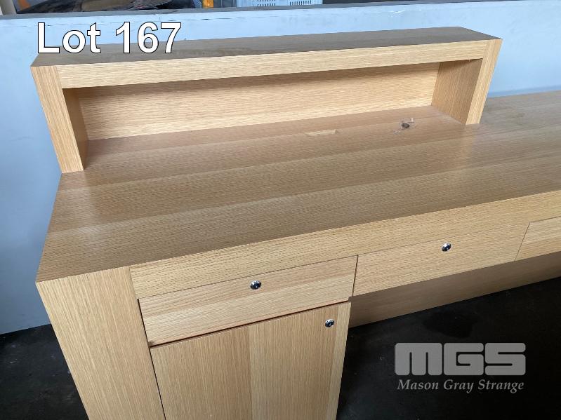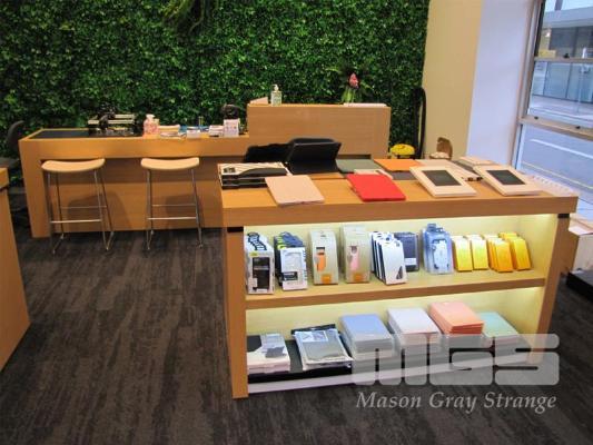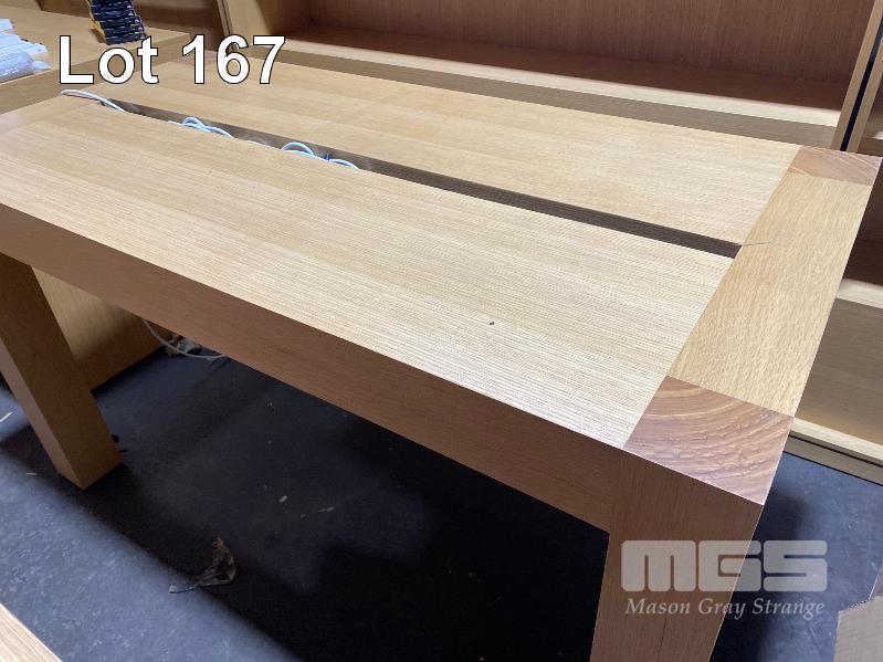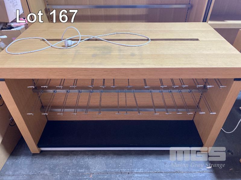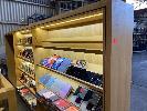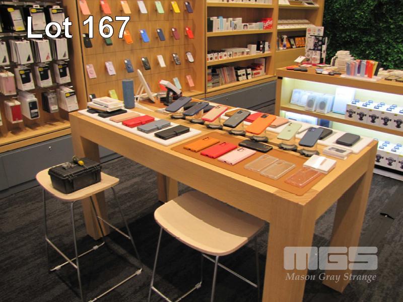 SHOP FITOUT COMPRISING 1 x SHELF UNIT, 1 x MAGAZINE SHELF UNIT, 1 x BAR HOOK DISPLAY UNIT & 1 x PHONE COVER DISPLAY UNIT, EACH 200 x 168cm WITH LED LIGHTING (SOME CABLES CUT) & BOTTOM MOUNT STORAGE DRAWER UNITS, 2 x TABLES (160 x 80cm), 2 x TABLES WITH UNDERBENCH BAR HOOKS & SHELVES (160 x 80cm), 1 x RECEPTION DESK (300 x 60cm), 2 x OFFICE CHAIRS & 4 x STOOLS (COLLECTION BY APPOINTMENT - FROM 25/5/2022)