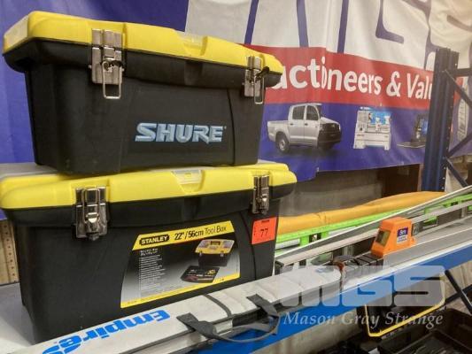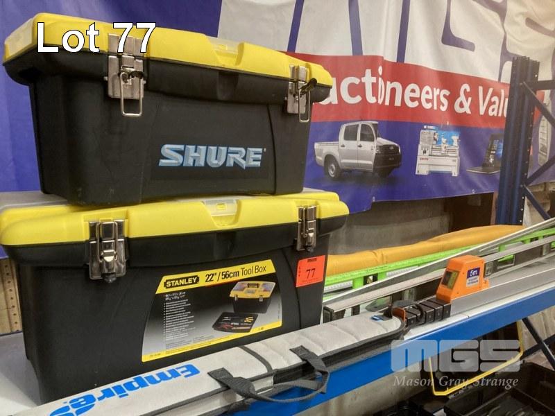 2 x TOOL BOXES, SPIRIT LEVELS, TELESCOPIC TAPE MEASURE, ETC
