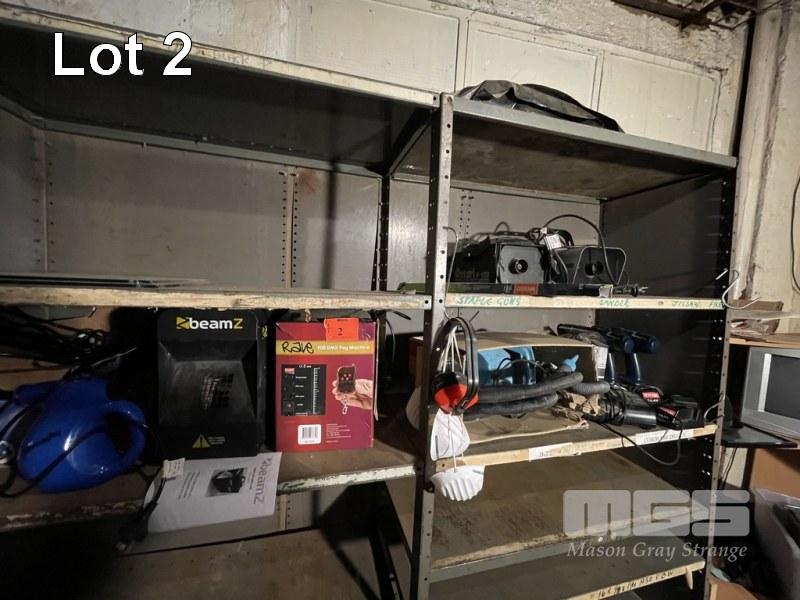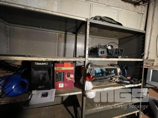 ASSORTED LIGHTING & SMOKE MACHINE, (ALL FAULTS), AIRLESS SPRAY UNIT, MAKITA CHARGER & RYOBI DRILL