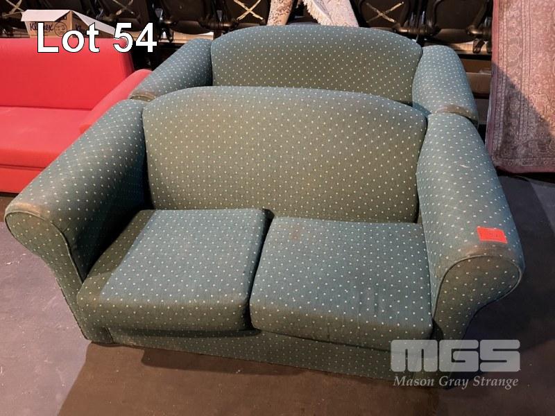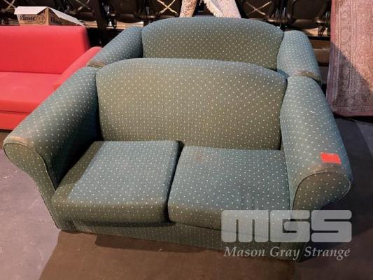 PAIR 2 SEATER SOFAS, UPHOLSTERED IN GREEN PATTERNED FABRIC, (WORN)