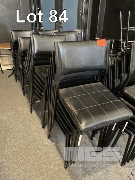 24 x STACKING CHAIRS, BLACK VINYL SEAT & BACK, STEEL FRAME