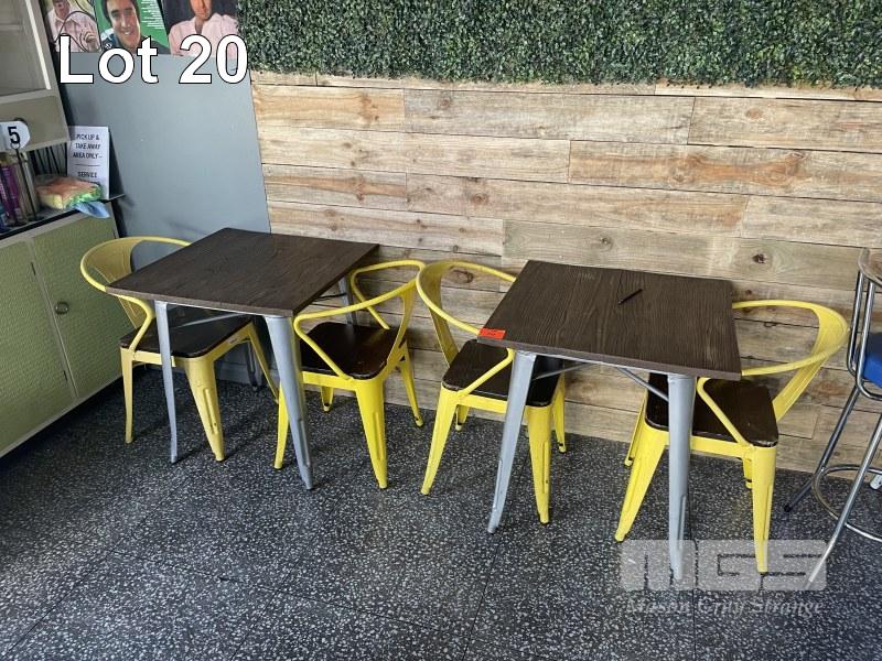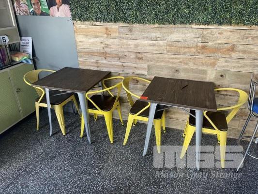 2 x CAFE TABLES, 70 x 70cm & 4 x YELLOW CHAIRS
