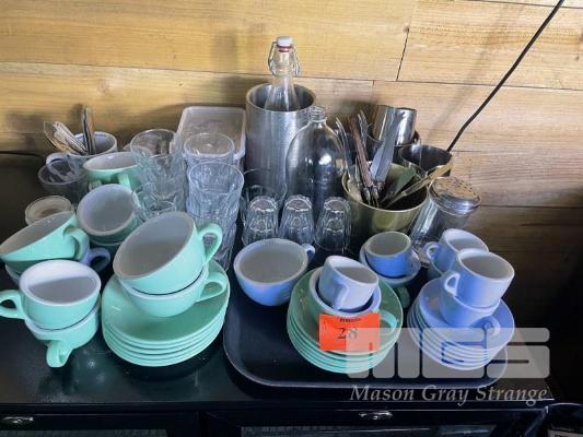 ASSORTED COFFEE CUPS, GLASSES, STAINLESS STEEL JUGS, ETC