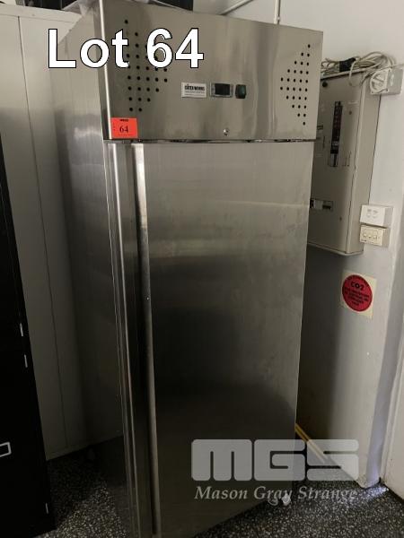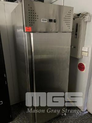 CHEFS FREEZER, CATERWORKS MOD: CWX-GN650BT STAINLESS STEEL CASED SINGLE DOOR 650 LITRE, TOP MOUNT COMPRESSOR (NEAR NEW BUT SMELLY AS POWER OUTAGE)