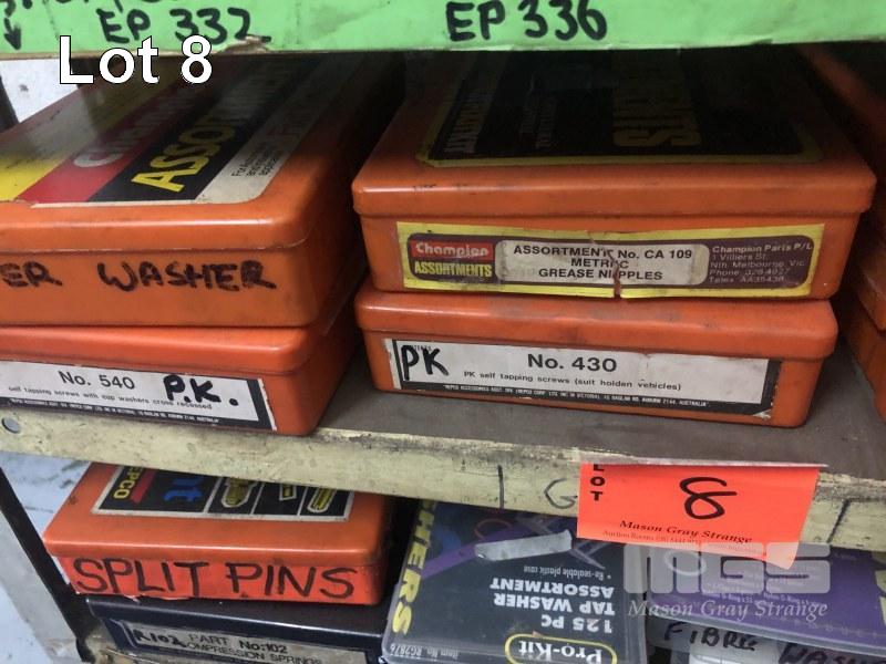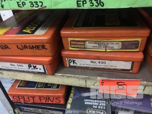 10 x GRAB KITS, COPPER WASHERS, HOSE CLAMPS, ROLL PINS, CAP HEAD BOLTS, ASSORTED BOLTS & SCREWS, CONTENTS OF 1 SHELF