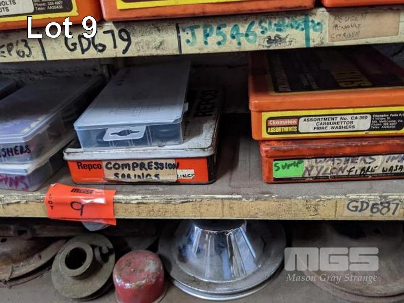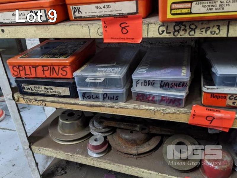 10 x GRAB KITS, SPLIT PINS, FIBRE WASHERS, SPRINGS, ROLL PINS, RUBBER GROMMETS, CONTENTS OF 1 SHELF