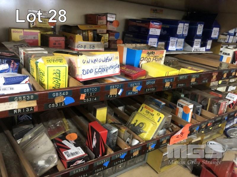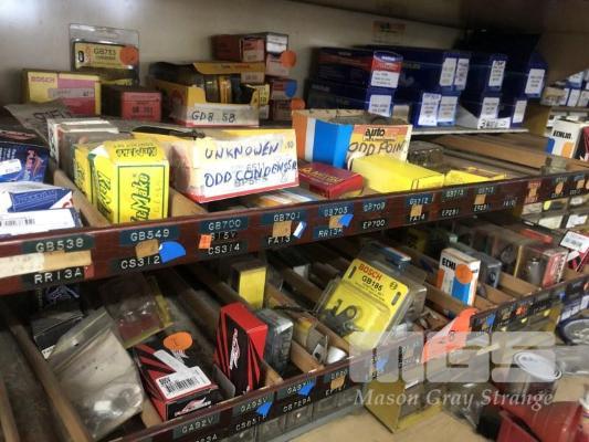 ASSORTED IGNITION PARTS, CONDENSERS, POINT SETS, CONTACTS & LIGHT GLOBES, CONTENTS OF 2 SHELVES