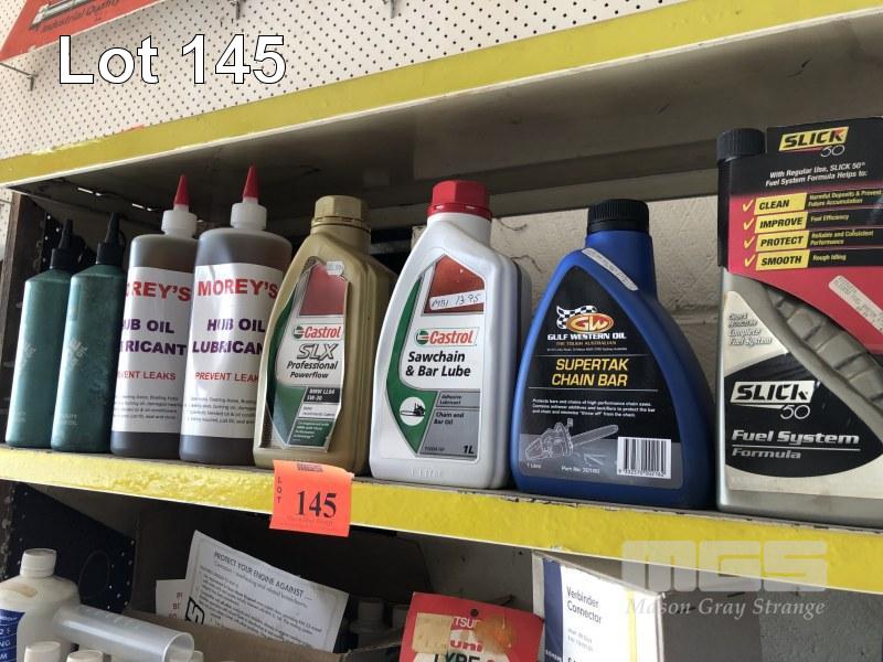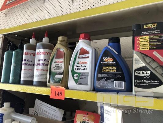 CONTENTS OF 1 SHELF LIGHT GEAR OIL, HUB LUBRICANTS, CHAIN BAR OIL ETC.