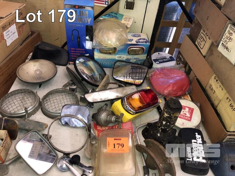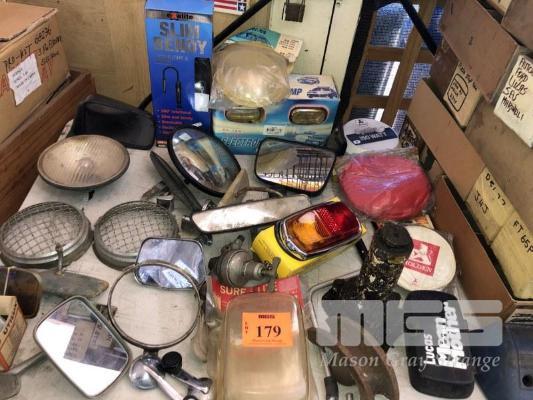 ASSORTMENT OF MIRRORS, VINTAGE LUCAS 7" LIGHT, HEADLIGHT COVERS, HELLA TAIL LIGHT, ELECTRONIC LAMP SET