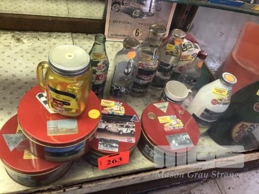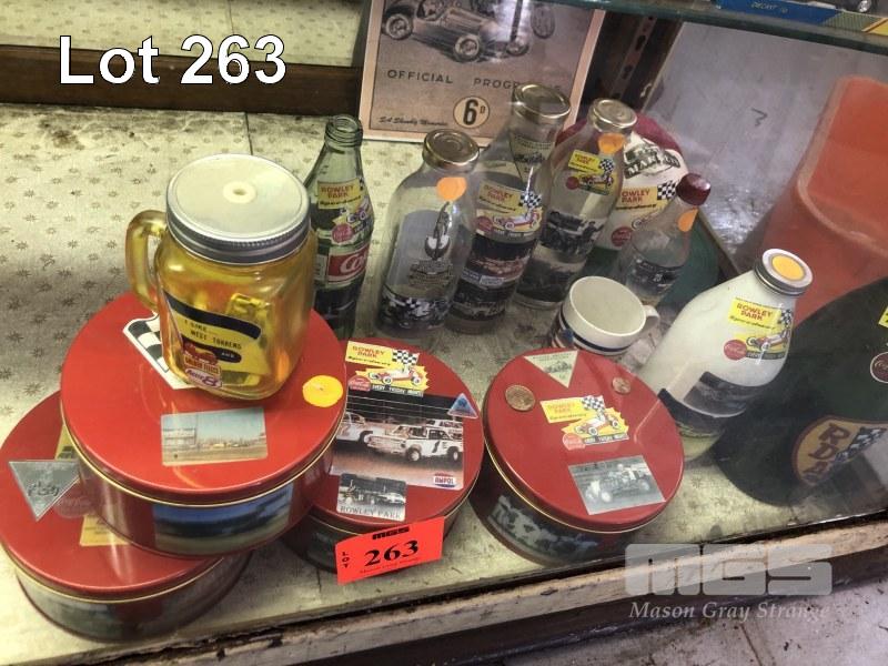 ASSORTED ROWLEY PARK COLLECTABLES, CAP, 4 x TINS, COKE BOTTLES, MILK BOTTLE, CHAMPAGNE BOTTLE, SPEEDWAY SIGN, COFFEE CUP