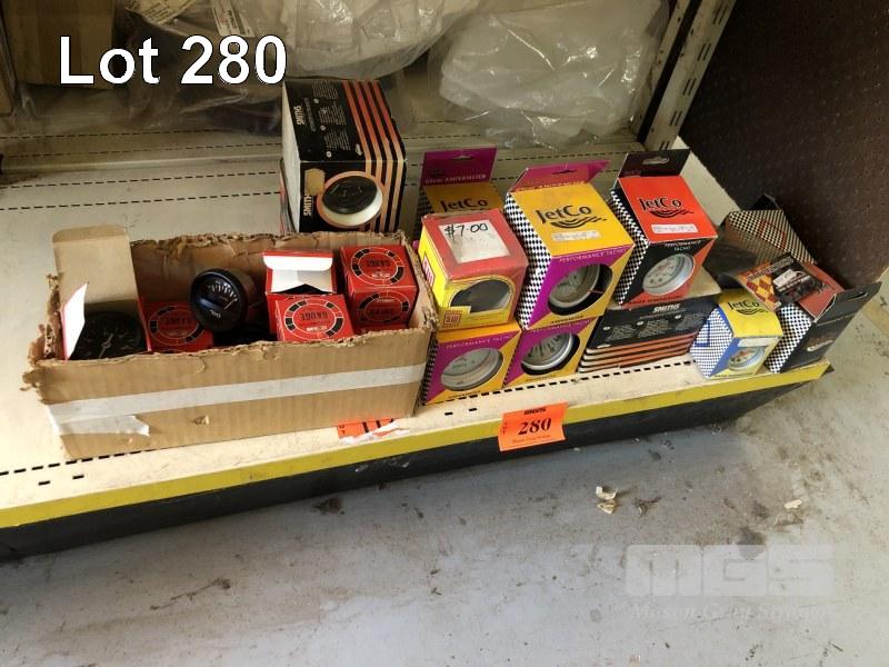 24 x ASSORTED AUTO GAUGES, OIL PRESSURE, AMP GAUGE, WATER TEMP, TACHO ETC.