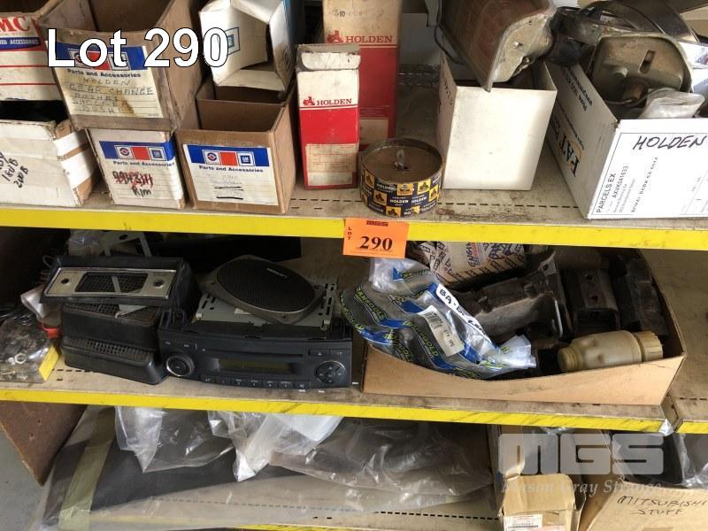 CONTENTS OF 6 SHELVES, ASSORTED AUTO SPARES, DATSUN 4 CYLINDER DISTRIBUTOR CAPS, MODEL:JP520, GENUINE HOLDEN EXHAUST PARTS, ENGINE MOUNTS, ASSORTED RADIO & SPEAKERS, HOLDEN ENGINE HARDWARE, NUT COVERS, RADIATOR HOSE COVERS, ASSORTED MITSUBISHI PARTS, COOLANT TANK, OVER FLOW BOTTLES ETC.