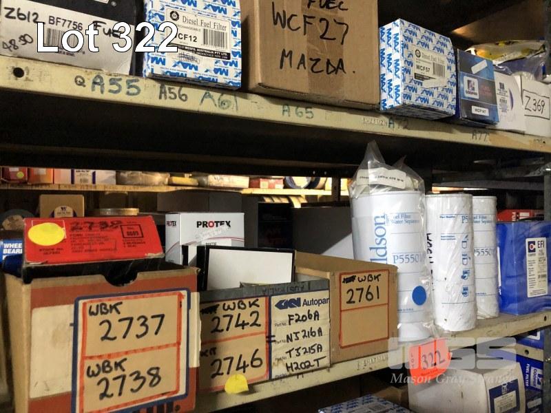 CONTENTS OF 5 SHELVES, FUEL FILTERS, DONALDSON, COOPER, MAX, BALDWIN, 3 x WATER SEPARATORS