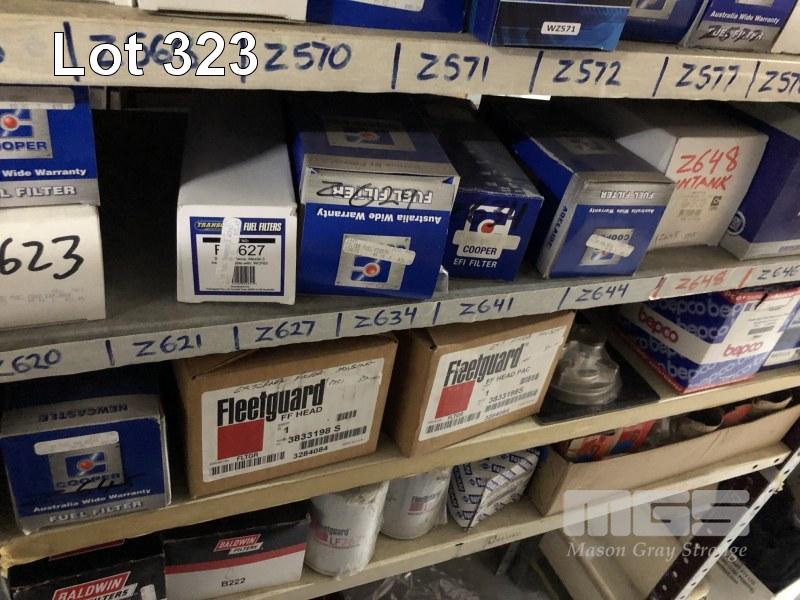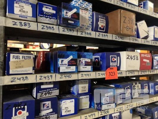 CONTENTS OF 10 SHELVES, FUEL FILTERS, COOPER, RYCO, MAX, FLEETGUARD, BALDWIN