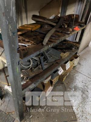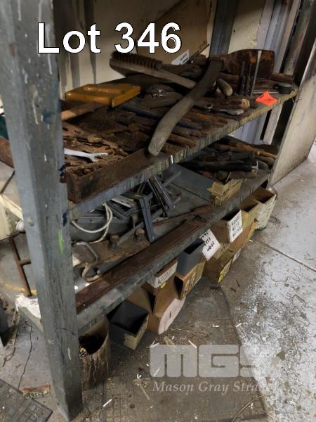5 TIER GALV SHELF & CONTENTS, ASSORTED OLD RUSTIC HAND TOOLS ETC.